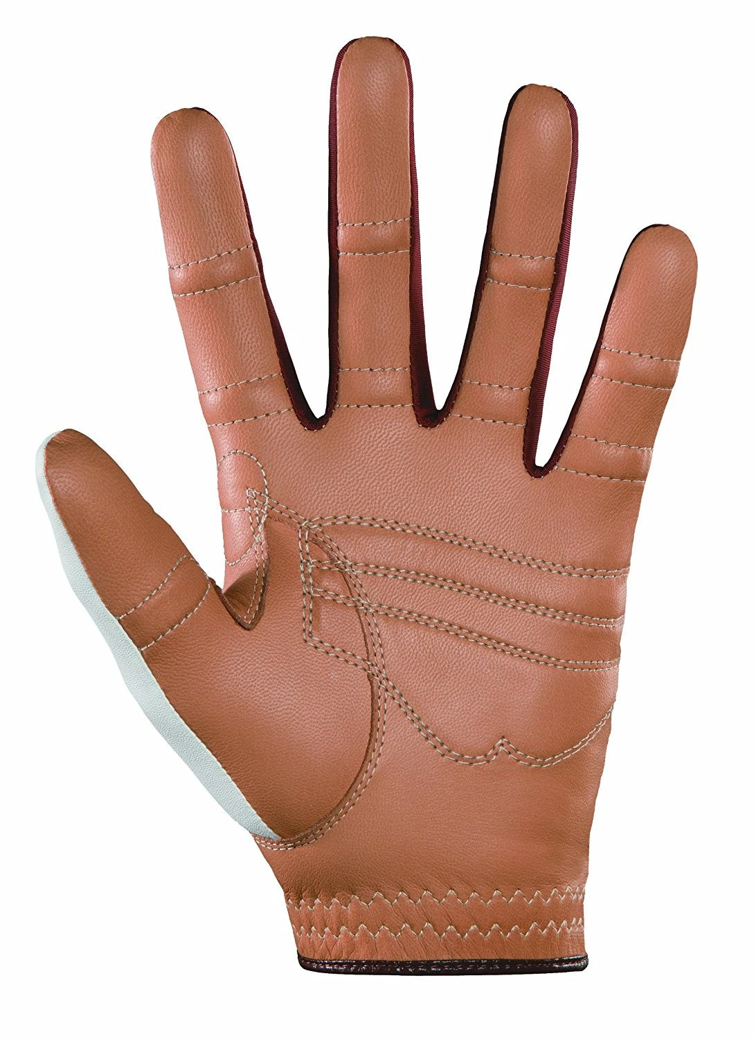 This glove is white on the back and features a caramel palm.